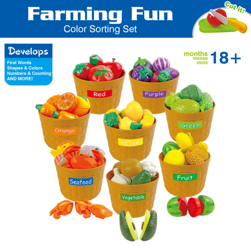 The set features an array of colorful barrels representing different food categories: red, purple, orange, yellow, green, seafood, vegetables, and fruits. Children can explore the world of colors and shapes as they sort and store ingredients of various shapes and hues. The simulated ingredients range from figs and apples to crabs and pizza, providing endless opportunities for role-playing and creativity.